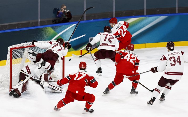 Într-un alt duel important, Danemarca a obținut victoria în fața Letoniei, scor 4-2 (3-1, 0-1, 1-0). Olesen a deschis scorul după doar 23 de secunde trecute de la primul face-off al meciului. Aagaard în superioritate numerică și Ehlers au dus scorul la 3-0, dar letonii au punctat și ei pe final de repriză prin Zile. În partea a doua, Tralmaks a înscris pentru Letonia și danezii mai aveau un singur gol avans. Balticii au luat cu asalt poarta daneză, dar nu au găsit drumul spre gol, iar Olesen a liniștit definitiv apele după ce a marcat în poarta goală pentru 4-2. Danezii au obținut astfel primul succes la această ediție a Jocurilor Olimpice, într-un meci în care au gestionat mai bine finalul și au profitat de erorile adversarilor.